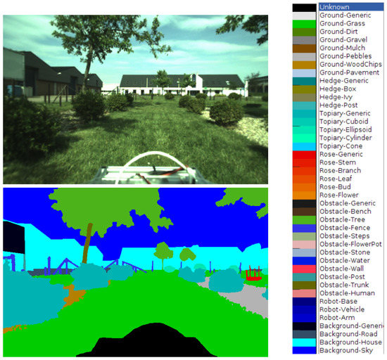 Sample annotated image. The captured image (top left) and its semantic map (bottom left) with colour-coded semantic classes (right). The black region at the bottom masks the capture system. The labels X-Y at the right form a hierarchy, where X is the top base class and Y the subclass.