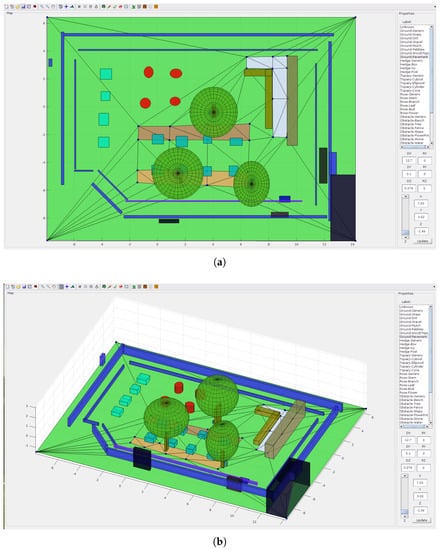 User interface of the 3D Map Editor with mesh of terrain and objects. Blue markers are control points of the terrain mesh. (a) 2D view; (b) 3D view.