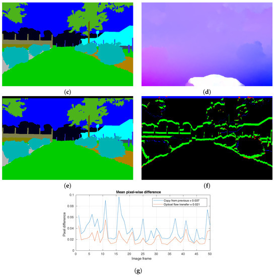 We annotated a sequence of 50 consecutive frames manually. Optical flow was calculated for all pairs of consecutive frames and used to transfer the labels to each frame from its predecessor frame. To evaluate the accuracy of the transfer, we compared the flow transferred labels with the labels simply copied over from the previous frame , as shown in Figure 9. For both cases, the difference from the manual annotation was calculated, i.e., and , and shown together in Figure 9g.