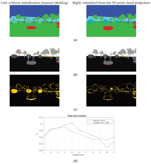 The visual comparison of label variance in Figure 10c shows that the initialization with the projected 3D model can help in the last case, i.e., force the correct semantic label. The projection however does not provide good boundaries due to the dynamic nature of the scene, e.g., branches moving in the wind, both at the time when the point cloud scans were captured and when the images were captured. This still forces the user to refine most of the boundaries manually. The measured pixel-wise consistency improvement of by 1% on average is not large. The benefit of projection initialization however becomes apparent if we instead consider the number of object instances, which would otherwise have to be manually corrected. This is usually done by a supervisor during a second pass through the sequence to check the quality of the first annotator’s work. Our initialization with the correct labels reduces the number of corrections required by the supervisor and in turn also the overall annotation time.