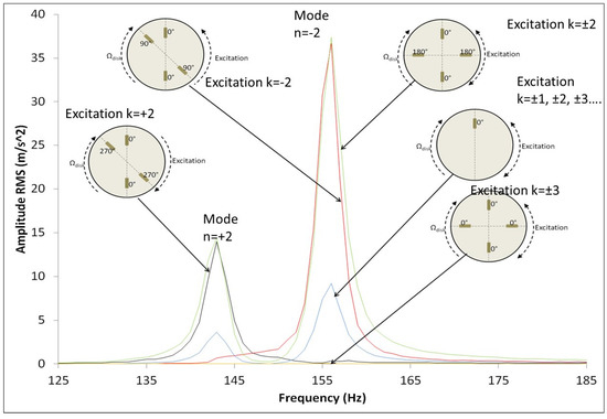 PZTp have also been used to experimentally obtain, for the first time, the natural frequencies of a rotating disk in water, which has a relevant interest in Hydraulic Turbomachinery. Presas et al. [23,24,25] proved experimentally the analytical model proposed by Kubota [17]. In these studies, PZTp are used as exciters of the rotating disk. Regarding the natural frequencies and mode shapes it is shown that when the disk rotates surrounded by a heavy fluid every natural frequency is separated in two natural frequencies and the mode shapes become rotating mode shapes (travelling modes), even for very low velocities. The lower mode rotates in the same direction as the disk and the higher in the opposite. The same author in [26] used several PZTp to simulate the response of a disk-like structure due to real excitation patterns occurring in hydraulic turbines (Rotor Stator Interaction). Particularly it is shown that in order to have a resonance, the excitation shape has to be directional and rotate in the same direction as the corresponding mode shape. This is shown in Figure 2, where it can be seen that resonance only occurs if the excitation has the same pattern as the mode shape. As seen in this figure, the excitation pattern is generated with simultaneous PZTp working with different phases.