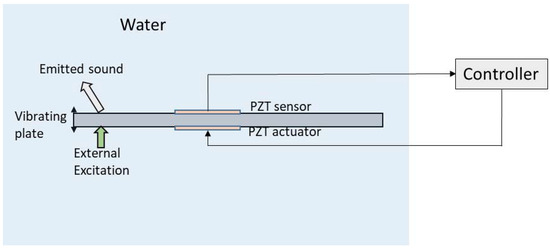 Active vibration control consists in reducing the amplitude of the dynamic response of a mechanical structure that is being excited by an external force. In order to suppress vibrations, a sensor and an actuator are needed. The signal of the sensor is used as input of an analogical or digital controller, which generates a signal for the actuator in order to suppress the existing vibration [28,29,30]. In the recent years, PZTp have been widely used as sensors/actuators for active vibration control [31,32] and particularly also for submerged structures, as they are easy to install, they do not affect the existing flow and they can be easily insulated with an epoxy layer. Besides PZTp, mechanisms based on eddy currents (Eddy Current Tuned Mass Damper [33]) and based on mechanical tuned dampers (Pounding Tuned Mass Damper [34]) have been recently investigated to suppress vibration in submerged pipe lines. The scheme representing the idea of active control of vibrations in a submerged structure is represented in Figure 3. It is worth mentioning that in this subsection we analyze studies dealing with active vibration control, that is, the reduction of vibration of submerged structures. As a consequence, the emitted sound is also attenuated, although it is not the primary objective of the control. In the next subsection, we focus on the cancellation of the emitted sound of an acoustic surface, from an arbitrary source location and not necessarily the vibration of the surface (Figure 5).