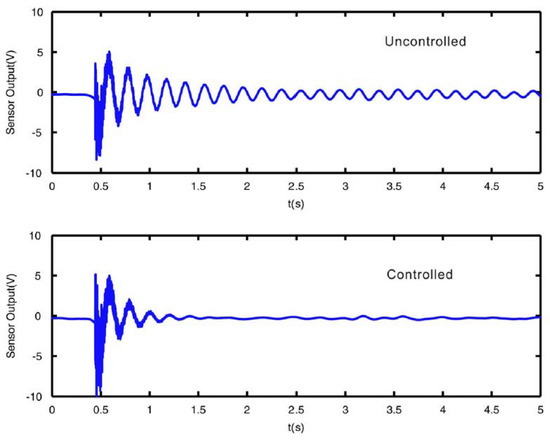 Regarding submerged thin plates, Li [41,42] simulated the active control of a fluid-loaded plate using PZT sensors/actuators. In [41] the plate is modeled by a finite element formulation taking into account the Fluid Structure Interaction. A negative velocity feedback control algorithm is used, showing that damping of the structure can be actively increased. A different approach for the controller design is followed in [42]. In this case, the modal approach, that is, the decomposition of the dynamic equations according to modal analysis techniques (see Section 3.1), is used to analyze the same problem. According to the author, this approach has the advantage of being simpler, compact and physically interpretable. Results from this study show that the modal controller can act on a particular mode shape by increasing the modal damping. Some studies include not only a theoretical modelling of the design of the controller, but also experimental validation. Kwak et al. [43,44], modelled the structure, the fluid effect, and the constitutive equations of PZTp, in a partially submerged plate equipped with PZT sensors and actuators to design the controller and validate the model with experimentation. In this case a MIMO (Multiple-Input Multiple-Output) digital controller is designed (two PZT actuators and two PZT sensors are used). An example of the damping effect of the active vibration control in the submerged plate is shown in Figure 4 [44]. In both cases, the plate is excited with an impact of similar force (external excitation) and the responses of the structure with and without active control are represented. It can be seen that the actuator quickly reacts after the first impact and is able to suppress the free vibration in a short time.