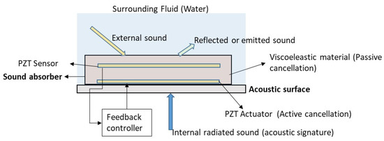 Besides the vibration control of submerged structures, the other interesting problem, where active control is required, is the reduction of the sound that is emitted by a submerged acoustic surface. Considering that the surface is an external acoustic surface of a system (biological or mechanical), the sound can be radiated from an external source and reflected on the acoustic surface or can be internally originated in the system, which is known as the acoustic signature of the system (Figure 5). The acoustic signature is the combination of all the acoustic and sounds emissions of a system (device, mechanism, vehicle, living organism, …). Typical submerged systems are ships, submarines [48,49], and also living organisms [50,51]. It is well-known that the detection of the acoustic signature with remote sensors is a field of interest for military purposes [52,53] and also in the study of marine species [50] as it can give information of the type, state, and position of the considered system. In the military field the main interest focuses on the reduction of the emitted sound originated internally (acoustic signature) in ships and submarines and also in the reduction of the reflected sound (Figure 5), with the purpose of making the system “acoustic” invisible to radars and detecting systems. Therefore, different passive and active noise cancellation (ANC) techniques have been developed in the past.