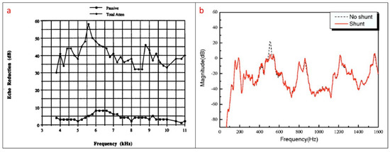 (a) Passive/active sound absorber in underwater. Reduction of noise for a broad bandwidth for passive mechanism and passive/active actuator [61]; (b) Reduction of noise for a particular mode with shunt method [67].