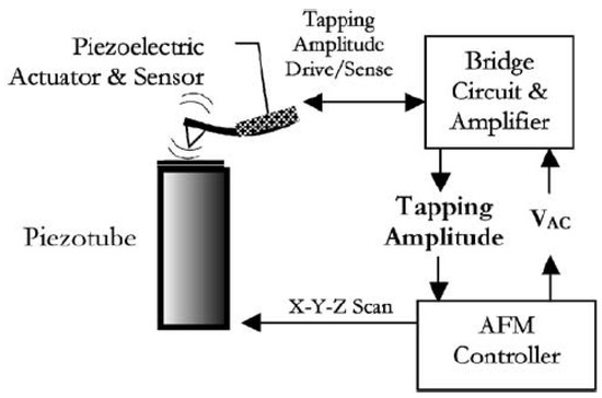 In both modes, the deflection of the cantilever due to the contact to the surface has to be measured. Although the traditional method is the beam deflection method by means of a Solid State Laser Diode, more recently, this measurement has been performed by means of a PZT sensor showing similar accuracy. As pointed out in many research works, the use of PZT transducers in lieu of other sensors permits achieving higher scanning speeds [79,80,81,82,83] and much more compact systems that avoid the problem of aligning the laser beam and refractions in submerged samples [82,84,85]. The complete scheme of an AFM working with an integrated PZT actuator and sensor is shown in Figure 7.