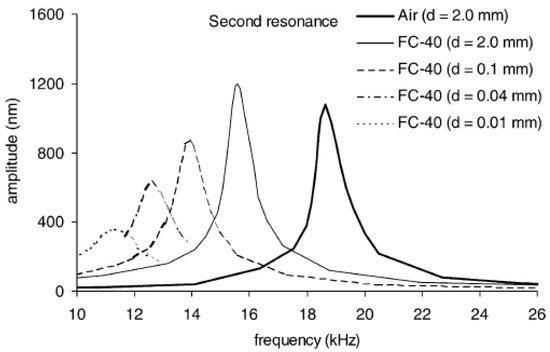 The works of Sader [90] and Green & Sader [91] provide theoretical models of the vibrating frequencies and modes of submerged microcantilevers. Sader [90] pointed out that analytical and numerical models used for larger structures normally consider the fluid as inviscid. Neglecting the viscosity of the fluid and the damping effects is a reasonable approach for macrostructures in order to predict the position of the resonant peaks, but in microscales damping effects greatly modify the position of the resonant peak and therefore viscosity effects have to be considered. In this work, Sader presents a theoretical model to determine the Frequency Response Function of submerged cantilevers considering an incompressible flow with viscosity. One of the most interesting conclusions is that when the dimensions of the beam are reduced, the viscous effects become more important and therefore the natural frequencies are more reduced with respect to those values in vacuum. Regarding the proximity of surfaces, Green [91] found that for distances larger than the width of the cantilever, the cantilever can be assumed to be immersed in infinite fluid. For smaller distances, strong dissipative effects that decrease the frequency and amplitude of the resonant peaks are observed. One of the research works where these effects are experimentally demonstrated is the work performed by Naik et al. [92]. As seen in Figure 8, strong dissipative effects greatly modify the shape and amplitude of the peaks when the cantilever is close to a rigid surface, due to an increased damping. The influence of the mass and damping of the tip (Figure 7) on the vibration characteristic of the AFM probe, which is not considered in [92], has been recently analyzed by Korayem and Nahavandi [93].
