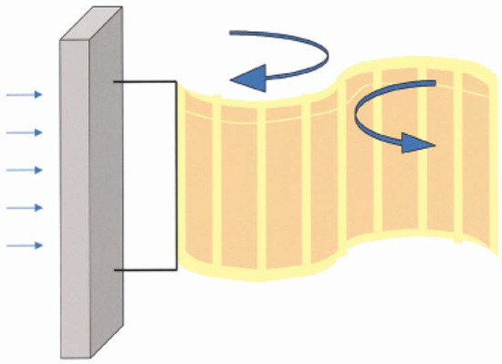 One of the first studies which analyzes the feasibility of obtaining energy by means of a flowing water current is the work made by Allen and Smits [105]. The basic idea is to place a piezoelectric membrane (called “eel”) in the wake of a bluff body and use the Von Karman street vortices that force the eel to vibrate. This study, which is focused on the flow analysis around the eel, shows that under certain flow conditions, the piezoelectric eel can exhibit a lock-in behavior and consequently large deformations. These deformations can be turned into electricity power by means of the piezoelectric effect. A scheme of a piezoelectric eel, placed behind a bluff body, is shown in Figure 9. The work of Taylor et al. [106] followed the idea of the eel and developed a prototype for extracting energy of flowing water in rivers and oceans. They use piezoelectric polymers (PVDF) for this purpose. A complete analysis of all the steps of the design—flow analysis (similar as in [105]), piezoelectric material, shape, and an optimized resonant electric circuit—is provided in this study. The optimization of the electric resonant circuit in energy harvesters is also a complex problem. Similar as discussed in Section 3.3 (semi-active sound cancellation), the idea is to determine the parameters R-L-C, where the device harvests energy in a more efficient way. Similar eel mechanisms have been also analyzed in similar studies and patents [107,108].