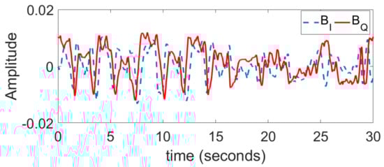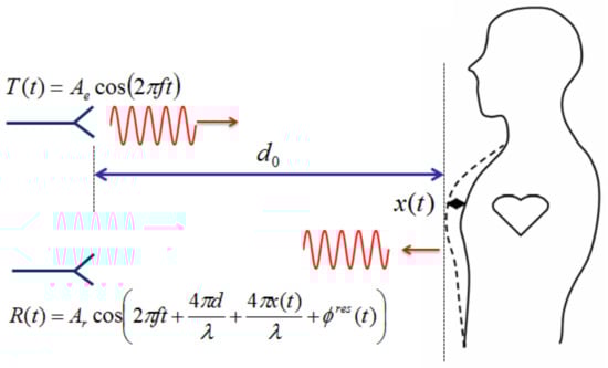In a continuous wave (CW) Doppler radar vital-sign detection system, a sinusoidal signal at carrier frequency f is transmitted towards a human body, located at a certain distance , as shown in Figure 1. The signal is reflected by the chest, whose movement is due to both heartbeating and respiration [,,]. The reflected signal is demodulated by an IQ quadrature receiver to avoid null-point detection issues []. The two baseband signals and are of the form