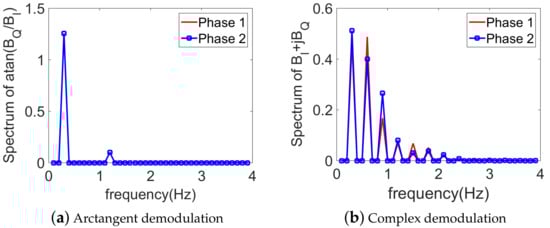 Spectral representation of the noiseless baseband signals, using (a) arctangent demodulation and (b) complex demodulation. mm, mm. bpm (i.e., ambiguity). Red line and blue square line represent different mutual phases ( and , respectively).