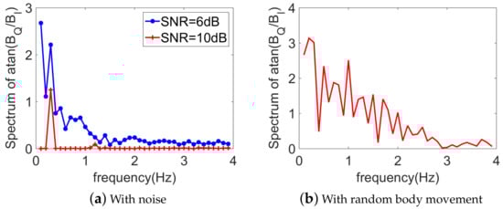 As seen in the previous paragraph, without noise, the arctangent demodulation is a straightforward technique as no intermodulation effect takes place. To investigate the robustness of the peak detection with respect to the noise, a zero-mean white Gaussian noise for different signal-to-noise ratios (SNRs) is added to the baseband signal. From Figure 3a, we can see that with a weak noise (e.g., SNR = 10 dB), the direct spectrum analysis of arctangent demodulation succeeds in retrieving two peaks associated to the heartbeat and respiration component, respectively. However, once the noise becomes larger (SNR = 6 dB), this technique does not work as the weak heartbeat signal is buried within the noise. Even without any noise, while an artifact of random body motion is present (which is represented by only half a cycle of a sine wave, with an amplitude 2 cm, a period s, and occurs every 5 s), the arctangent demodulation is totally overwhelmed as all peaks in the spectrum are of the same order, as shown in Figure 3b.