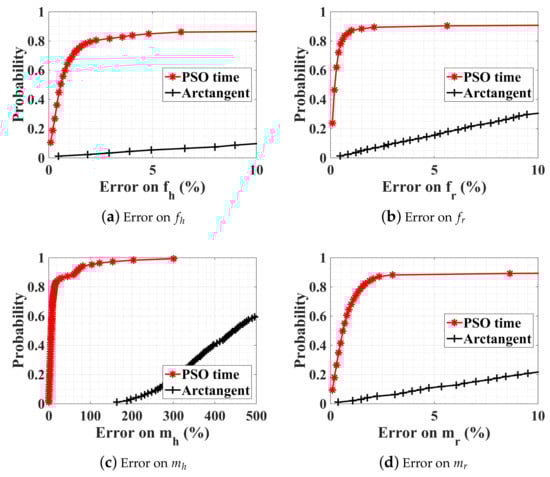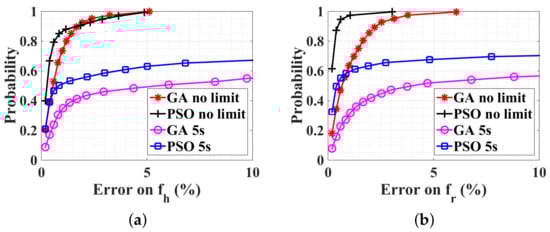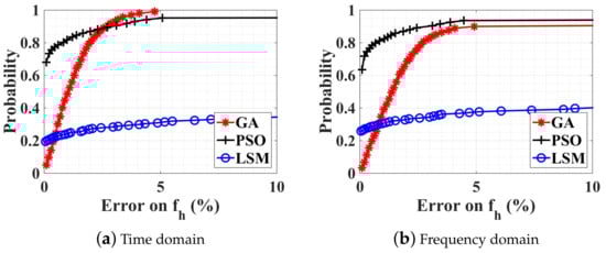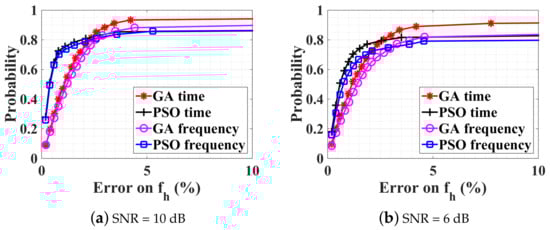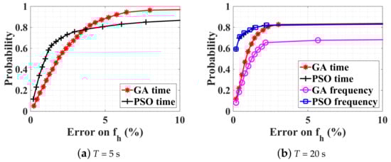 Maintaining an SNR of 10 dB, the observation time duration is investigated by using two additional windows of 5 s and 20 s, whose results are shown in Figure 6a,b respectively. For an observation duration of 5 s, the corresponding frequency resolution is Hz, which sets the best achievable accuracy. This is not well suited for the considered problem, as the optimization in the time domain under the same condition is always more accurate than Hz. From Figure 5a and Figure 6a, it is noticeable that for both GA and PSO, results are more accurate with s than with s with an estimation error less than 10%. Moreover, the estimation time is much less: only s for GA and s for PSO. However, for more accurate results (e.g., less than ), s gives higher probability where the CDF curve is steeper.