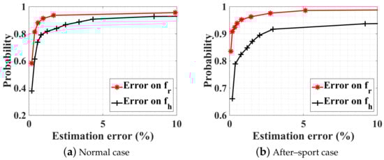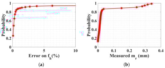 Here, a particular case is considered where the person does not breathe, that is, mm. The cardiac rhythm is supposed to be normal, taking a random value bpm. The optimization result on is always accurate, as shown in Figure 9a, where the probability is for the estimation error less than . The absolute estimated amplitude of respiratory displacement is given in Figure 9b, which is always less than mm with a probability of . Such a weak estimated value shows that the human body does not breathe any more or his respiration is very weak, which may indicate an emergency situation.