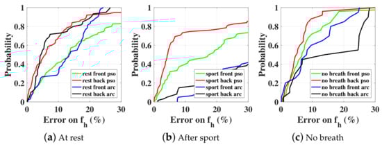 Figure 6b shows results for s. The estimation time for GA is increased to s ( s) in the frequency domain (time domain), and to s ( s) in the frequency domain (time domain) for PSO. In particular, for frequency-domain GA, performance quickly decreases as the time-window length increases. Comparing the optimization result in the time domain for s and s, as shown in Figure 6a,b, with a probability of 80%, the estimation error is less than 4% with GA or PSO for s, and less than 2% with PSO for s. However, beyond a certain error on , we observe that with 20 s, the probability does not increase any more, whereas it does with a 5 s window. Further simulations with different time windows show that, if the window size increases, the precision can actually be improved if a suitable threshold is chosen on the cost function to truncate the optimization process. If the threshold is kept constant, a saturation effect is indeed observed. In these simulations, the parameter is kept constant during the observation window (whether it is 5 or 20 s). In a real scenario, breathing and heartbeat rate will be time dependent. Since the accuracy reached is considered satisfying for medical applications and a constraint on the computation time is preferred in this work for real-time applications, this phenomenon is not further illustrated here. Consequently, the next section investigates the robustness of these techniques in a broader range of scenarios.