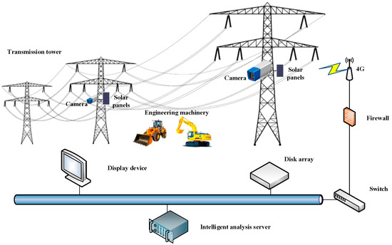 Stable and reliable operation of the power system is the fundamental guarantee for the development of power supply security. As an important part of the power supply system, the security of overhead high-voltage transmission lines is closely related to the normal operation of the entire power system. Since the power supply distance is so long, the overhead high-voltage transmission line frequently passes through cities and suburbs, where construction sites are often presented. In recent years, with the development of the construction of urban infrastructure, the area of power supply protection is constantly invaded by various engineering vehicles, especially bulldozers and excavators, which often damage the transmission equipment and pose a serious threat to the security of the power supply. To avoid this kind of external force damage, in the past, the power supply departments would carry out on-site monitoring using video surveillance by attendants and there is no intelligence analysis during this procedure, which increases the fatigue of the monitoring attendants. Meanwhile, the limited human resources cannot meet the needs of the growing scale of power grid monitoring. How to effectively avoid the external force damage caused by engineering vehicles is a challenging problem that researchers urgently need to solve. Recently, several kinds of methods for monitoring power supply areas have been developed that we can use for reference. Surface wave sensors [1] can detect open circuit faults on power cables but are not suitable for early warning of external force damage. Inspection methods based on manned aerial vehicles [2,3] are able to inspect long-distance overhead high-voltage transmission lines within a short time, whereas the disadvantages of this kind of method are equally obvious, which can produce high accident risk and high inspection cost. Another alternative approach to power line inspection is based on unmanned aerial vehicles. Larrauri et al. [4] propose an automatic system to inspect overhead power lines using an unmanned aerial vehicle, which can detect and identify distances and fault location by image processing technology. Luque-Vega et al. [5] propose another unmanned aerial system using the quad rotor helicopter to inspect the devices and components in the high-voltage power line corridors, which use a color camera and a thermal infrared camera. The above methods focus on fault detection and are not very suitable for external force damage detection. Of course, we can also detect engineering vehicles using aerial systems, however, these kinds of methods are often based on the cycle patrol mode, which has difficulty monitoring moving objects in a fixed area in real time.