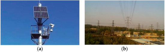 (a) The installation position of the camera and the solar panel on the pylon in practical application; (b) is the scene of power line corridors captured by the camera.