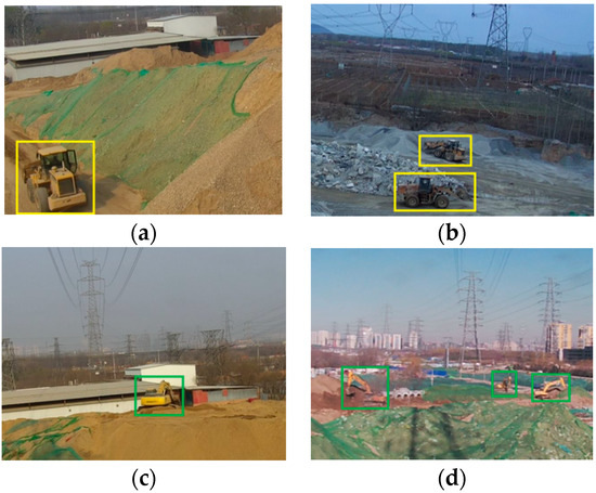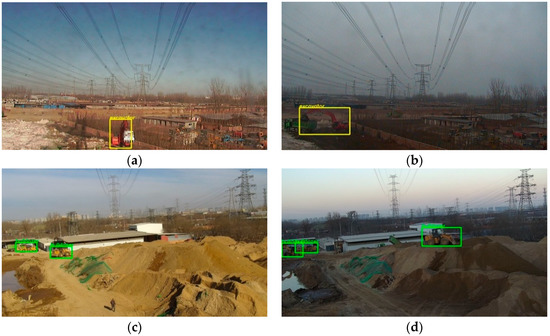 The images of the objects need to be detected in different scenes. The size of the original image is dpi. In order to display the annotated objects well here, we cut the dpi size of the area containing the annotated objects in images. (a,b) show the annotated objects of bulldozer. The color of the annotation box is yellow; (c,d) show the annotated objects of excavator. The color of the annotation box is green.