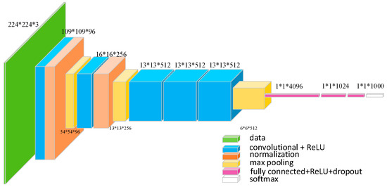 The entire framework is based on Faster R-CNN. Our task is to detect two types of engineering vehicles that invade into the monitoring area of overhead transmission lines: bulldozers and excavators. Considering that the categories that need to be detected are few and the number of samples in the dataset is small, we choose the pre-trained model of VGG_CNN_M_1024 [19] as the initial weight. Compared to the VGG-16 [20] model which has 13 shareable convolutional layers, the VGG_CNN_M_1024 model has 5 shareable convolutional layers, which is shown in Figure 4.