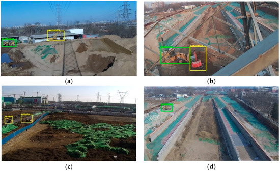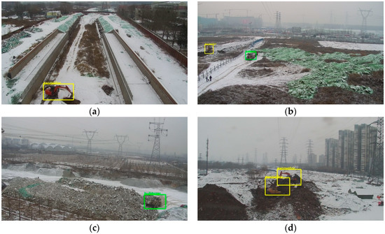 The detection results of varied scenes. The bulldozer in the picture is labeled in green and the excavator is labeled in yellow. (a) The whole image is 62 times larger than object areas; (b) the whole image is about 27 times larger than object areas; (c) the whole image is about 56 times larger than object areas; (d) The whole image is about 149 times larger than the object area.
