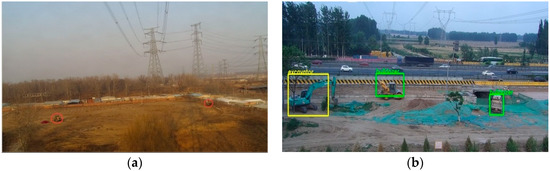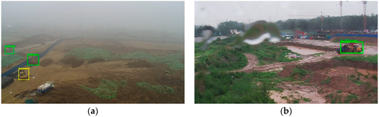As shown in Figure 9a, the image captured by the camera in foggy weather is blurred. Some detailed features of the object are not obvious enough in this case. In the scene images collected on the rainy day, as shown in Figure 9b, rain falling on the lens blurs the camera’s view and the light is usually dimmer in this weather. These factors increase the difficulty of the testing. From the test results, we can see that our detection system is robust to severe weather. In most cases, the system can detect engineering vehicles invading the monitoring area of overhead high-voltage transmission lines.