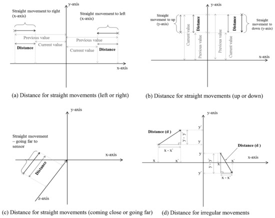 If the direction is vertical (irregular) to any side (any axis), the distance travelled, cannot be simply calculated by subtracting the position between two frames on any axis, because the changes are not on the axis and so if the changes are considered on the axis, then the distance will be less than the actual distance travelled. Equation (3), is used to calculate such irregular distances. Once distance for any irregular movement is calculated, the magnitude part of the velocity can be calculated by using Equation (2). The distance computation is graphically described in Figure 1a–d.