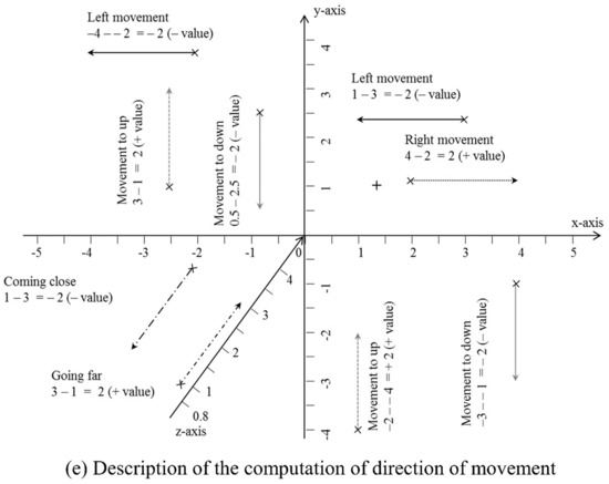 Velocity is calculated after determining the direction of the movement, which is described in Figure 1e. The distance travelled for the movement is divided by the time taken for the movement to calculate the speed, as shown in Equation (2). The time taken for the movement is 1/15 s, because the sensor generates 30 frames per second and the joint position is taken after skipping one frame (time for two frames). For the magnitude component of velocities, the same concept as for speed (Equation (2)) is used except that the speed for the shoulder center and hip center is also calculated together with direction.