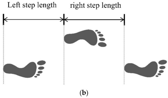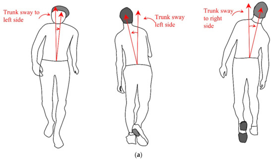 Illustration of trunk sway and step length. (a) Trunk sway; (b) Step length.