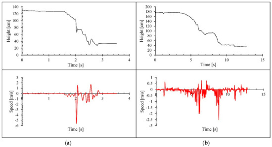 Changes in height and instant speed observed for some fall event. (a) Fall while sitting chair; (b) fall while trying to sit on floor.