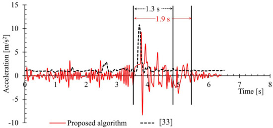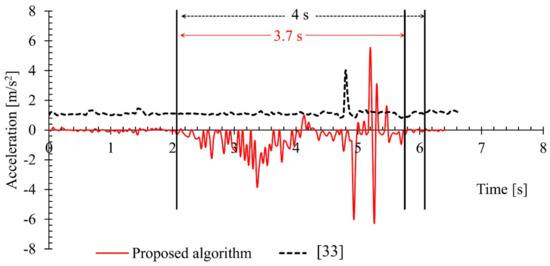 The proposed fall detection algorithm was also benchmarked on the motion data obtained from the URFD dataset [38]. The dataset contains 70 sequences (30 falls and 40 activities of daily life) in front view. The results of the proposed algorithm on this dataset were compared with results of the study representing the dataset. The experimental results of the related work representing the URFD dataset which used only SVM on the depth data and the results of the proposed algorithm on the URFD data, is compared in this section. The proposed algorithm was run on the acceleration data available with the URFD dataset; the generated results are shown in the following Table 1. The proposed algorithm successfully detected 29 out of the 30 fall events and it failed to classify one sample of fall event. For the other activities of daily life included in the dataset, the proposed algorithm identified 33 activities and failed to classify 7 activities.