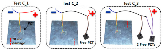 To evaluate the performance of the EMI method when the impedance signature is reduced, three 15 mm square PZT transducers were prepared. Three test cases were created and tested, where the first case “C_1” involved attaching one of the three PZT transducers to the center of the 100 mm square metal plate with a thickness 0.3 mm, as shown in Figure 2. This configuration was then connected to the AD5933 evaluation board, and then progressive damage was created using a metal cutter along the dotted line up to 20 mm. During this process, impedance signatures were measured by exciting the PZT transducer at every 2 mm of damage in the frequency range of 25 kHz to 65 kHz in the 80 Hz interval. Here, the frequency range was chosen by sweeping various ranges and selecting the most appropriate range with multiple resonance peaks. Thus, including the reference signature measured before any damage was introduced, 11 impedance signatures were acquired. The second test case “C_2” was conducted by attaching an additional PZT transducer in series to the C_1 configuration (also shown in Figure 2). This additional PZT is left freely in the air, as the attachment will affect the amplitude of the impedance signatures as the equivalent impedance of the two transducers is changed. In this case, since the capacitance of the PZT transducer is directly proportional to its size, the amplitude will decrease. For this second test (C_2), progressive damage is introduced in the same manner. Again, impedance signatures were measured for every 2 mm of damage up to 20 mm in the same frequency range as above, resulting in 11 impedance signatures. The third test case “C_3” involved attaching another PZT transducer in series onto the C_2 configuration, which further increases the overall area of the PZT transducers. Again, progressive damage was introduced along the dotted line and the impedance signatures were measured in an identical manner to the previous two test cases. Through these three experiments (C_1, C_2 and C_3), 33 impedance signatures were acquired in total.