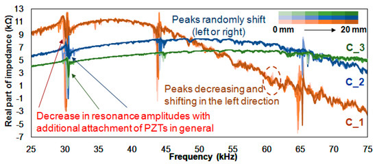 Figure 3 shows all the impedance signatures for the three cases where the difference in the height of the amplitudes can be clearly seen. The amplitudes, in general, significantly decrease from C_1 to C_3. The frequency ranges around 30 kHz, 44 kHz and 65 kHz are a good example of this. First, examining the impedance signatures between 28 kHz and 32 kHz, the center of the resonance peaks seems to shift slightly rightward from C_1 to C_3 with the overall amplitudes decreasing, which possibly indicates that progressive damage is changing the resonance frequency of the host structure. For C_1, C_2 and C_3 the maximum peak-to-peak heights of the resonance are around 15 kΩ, 7 kΩ and 5 kΩ, respectively. Next, examining the impedance signatures between 43 kHz and 46 kHz shows a similar result where resonance is shifting rightward as damage progresses. However, the maximum peak-to-peak amplitudes for the three test cases are around 14 kΩ, 5 kΩ and 1.5 kΩ from C_1 to C_3, proving that an increase in PZT area does not have a linear relationship to the maximum height of the peak-to-peak amplitudes. Finally, at the frequency range between 63 kHz and 67 kHz, the resonance is again shifting in the rightward direction with damage. This can be clearly seen in the C_1 test. In addition, another observation made here is the decrease in the peak amplitudes with progressive damage for C_3. The peak that exists at 66 kHz is reduced and virtually disappears after 20 mm of progressive damage.