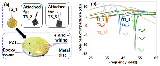 In the previous section, experiments were used to confirm that a decrease in the amplitude of the impedance signature will also decrease the RMSD and MAPD values (but not CCD values). Thus, to further the investigation, the amplitude reduction effect on the EMI method subjected to damage in various frequency ranges should be examined. To achieve this, the conventional method of attaching a PZT transducer to the surface of the host structure is changed in order to create resonance frequency ranges in various regions. In Na et al. [4], the authors introduced a technique for creating resonance frequency ranges in certain regions regardless of the properties of the host structure. The core of this technique involves attaching a PZT transducer on to a metal disc, then attaching the metal disc onto the host structure. Here, the resonance frequency range can be either increased or decreased simply by changing the thickness of the metal disc. Thus, in this study, this idea is applied to create various frequency ranges where additional free PZT transducers were utilized to reduce peak amplitudes. This configuration can be seen in Figure 4a, where a 15 mm square PZT transducer is attached on top of the metal disc with a 25 mm diameter and 3 mm thickness, then, two more devices were created using two different metal discs with thicknesses of 4 mm and 5 mm. These three devices were used to create 9 test cases referred to as “T3_x”, “T4_x” and “T5_x”, where the first number represents the thickness of the metal in mm and variable x is the total number of PZT transducers connected. For example, T3_1 is the 3 mm metal disc with only the PZT transducer attached, T3_2 is the same with an additional free PZT transducer attached in series, and T3_3 has another free PZT transducer attached to T3_2 in series.