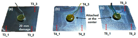 Figure 5 shows the EMI method used to test 9 cases in order to evaluate the damage detection performance using 3 different resonance frequency ranges. Figure 5a shows the three test cases, which will be referred to as T3_1, T3_2 and T3_3 hereafter. Again, the first number represents the thickness of the metal disc, with the second number representing the number of PZT transducers connected for the test. The PZT attached metal disc is adhered to the center of the metal plate using an epoxy glue and was left at room temperature for 24 h to ensure full curing. For the test, damage was created using the same method introduced in Section 2, where a metal cutter was used to cut the metal plate up to 20 mm with impedance signatures being measured at every 2 mm of damage. These three test cases were conducted on the same metal plate as shown in the figure. The damage intensity of each of the cases was assumed to be the same, as the distance from the PZT transducers was identical. For each test case, 11 impedance signatures were acquired in total (including a reference signature) in the frequency ranges between 25 kHz to 65 kHz. Figure 5b, c shows the test specimen for the remaining 6 tests (T4_1, T4_2, T4_3, T5_1, T5_2, and T5_3), where the tests were identical to Figure 5a with different metal disc thicknesses.