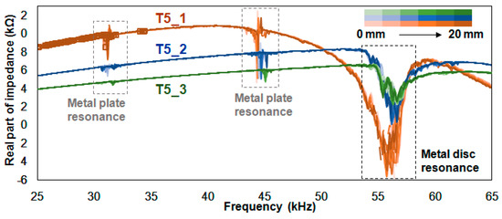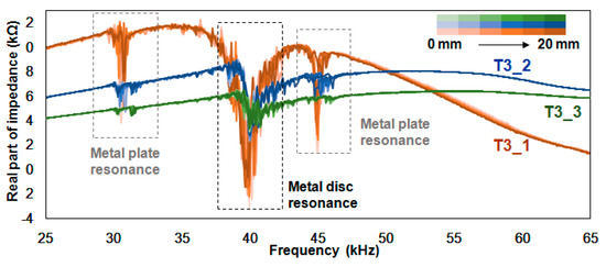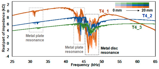 Table 3 shows the values calculated using the three statistical methods for Figure 7. With the extra 1 mm thickness of the metal disc, one might expect that the values calculated using statistical methods would be lower compared to the T3_x cases. However, all the averaged values for each column are larger compared to those in Table 2. For the RMSD values, the averaged values for RT4_1, RT4_2 and RT4_3 are 9.52%, 5.61% and 3.28%, respectively. For the MAPD values, the averaged values are 19.11%, 2.33% and 1.31% for MT4_1, MT4_2 and MT4_3, respectively, experimentally proving once again that the height of the peaks of the impedance signatures are very important when using the MAPD method. For the CCD values, the averaged values are 6.15%, 10.00% and 3.58% for CT4_1, CT4_2 and CT4_3, respectively. One of the reasons why the calculated values are relatively larger in this case is the overlap of the resonance of the metal disc and the plate. As shown in Figure 7, this seems to amplify the height of the resonance peaks in the frequency range that corresponds to the resonance of the metal plate.