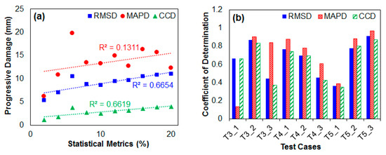 In this section, a linear regression analysis is performed using the results from the previous subsection to evaluate the performance of the EMI method subjected to different frequency ranges and statistical metrics (RMSD, MAPD and CCD). Figure 9a shows the scatter plot using T3_1 results from Table 2 (the 2nd, 5th and 8th columns). Three lines of best fit are drawn where the coefficient of determination (R2) is 0.67 for RMSD, 0.13 for MAPD and 0.66 for CCD. As damage increases, all three lines show an increasing trend where the slopes have virtually the same steepness. The R2 of 0.13 obtained from the MAPD values is considerably lower than the other two statistical metrics, and one of the reasons for this is the randomness of the MAPD values. This randomness can be caused by damage to either a node or an anti-node of the metal plate, which can have a significant effect on the impedance signatures. In Figure 9b, the remainder of the results from the previous subsection are used to plot a bar graph of R2 values, where the three bars (RMSD, MAPD and CCD) at T3_1 is of Figure 9a. By observation, while the T3_x, T4_x and T5_x cases have different resonance frequency ranges, it seems that this difference does not have a significant impact on the regression analysis results as it appears to be random. For example, among the T3_x cases, the T3_2 case seems to have highest R2 values. Among the T4_x cases, the T4_1 case has the highest R2 values, while of the T5_x cases, the T5_3 case has the highest R2 values. These results show the complexity of the EMI method data analysis. However, one common feature that can be noted is that the MAPD values are always higher compared to the RMSD and the CCD values, with the exception of the T3_1 case. In addition, the RMSD values are always higher than the CCD values except for the T5_2 case. Overall, the three statistical metrics have similar values for most of the cases, with the T5_3 case having the highest values out of all the values. Another observation that can be made here is that when the impedance signature amplitude decreases from T4_1 to T4_3, the R2 values also decrease, whereas the T5_x cases result in the exact opposite (R2 values increasing from T5_1 to T5_3). This shows that the size of the amplitudes does not have that significant an effect on the R2 values.
