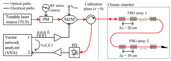 In Equation (8), denotes the reflectivity profile of the m-th grating, is the physical length of its preceding fiber section and is the modulation frequency of the VNA. With the boundary condition , the complex frequency response of a grating array with M spans is: