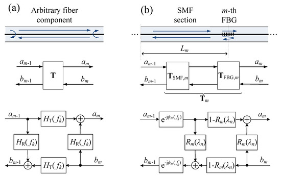 (a) Model representation of the transfer matrix of an arbitrary fiber component, decomposed in a transfer function in transmission and reflection and , respectively. (b) Model representation of an FBG fiber span with a single mode fiber (SMF) section followed by a grating.