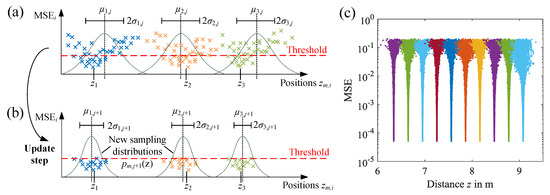 We perform update steps of the sampling distributions, by analyzing the statistics of the most promising proposal positions . These are selected by applying a threshold given by a certain quantile q of the values. All position proposals that correspond to MSE values that exceed this threshold are discarded, and the sample means and variances of the remaining position proposals are calculated. The sampling distributions for the next batch are then updated according to these sample means and variances. This selection and update step is also illustrated in Figure 3a,b. After several update steps, the sampling distributions will narrow and their centers approach the true positions.