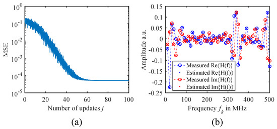 (a) Convergence of the MSE in the position estimation algorithm vs. the number of update steps. (b) Estimated real and imaginary parts of a measured frequency response .