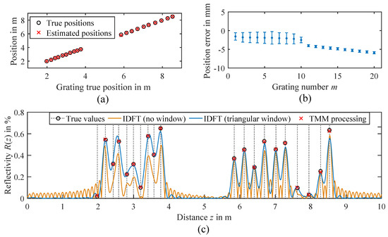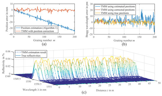 Figure 11a shows the remaining position errors corrected by the estimated systematic position errors , leaving only a stochastic variation with a standard deviation of 1.6 mm. This significantly improves the TMM performance estimating the Bragg wavelengths, so that a standard deviation of the Bragg wavelength error can be reached that is just 0.1 pm worse than obtained from the estimation using the true positions. Figure 11c shows the resulting reflectivity profiles of the 200 FBGs using the position correction, compared to the true reflectivities as specified in the simulation.