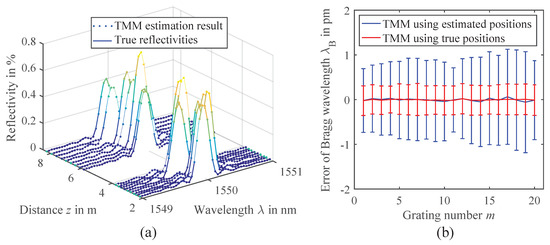Most important for FBG sensing of course is the Bragg wavelength interrogation, which is analyzed next. Figure 6a shows the reflectivity estimation result for one constellation of the simulated FBG arrays. It can be seen that the reflectivity profiles can be reconstructed very well by the TMM algorithm, as the estimated reflectivities (dots) exactly match the specified true reflectivities (lines). In the next step, the Bragg wavelengths are extracted from the estimated reflectivity profiles. A variety of methods exists for the Bragg peak detection [39]. For simplicity, we chose to fit a Gaussian function to the reflectivity profiles, which is a simple and common method, working well with the -shaped profiles (15) of weak and uniform gratings. Additionally, only the main peak is considered in the fit by applying a threshold of 20% from the peak value to reject the side lobes of the Bragg reflections. The errors from the specified Bragg wavelengths are determined, and the means and standard deviations for the individual gratings are calculated. In Figure 6b, it can be seen that the Bragg wavelengths can be determined with almost zero bias and a standard deviation of 0.9 pm on average, if the TMM uses the positions estimated in the previous step. This meets the requirements of most applications, usually tolerating errors of up to 1 pm [39].