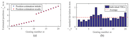 The estimation results are depicted in Figure 11. As before, we first estimate the grating positions , using the EDA-based Algorithm 1 with a nominal grid of 25 cm as the initial positions. The resulting estimated positions are plotted in Figure 11a. As already observed in Figure 5b, to some extent, the estimated positions show a systematic position error. Unfortunately, this error adds up to 35 mm for the last FBGs in the given array and also influences the following estimation of the Bragg wavelengths with the TMM. As a result, an increased average Bragg wavelength error of 5.5 pm is observed in Figure 5b, compared to pm, which would have been achieved if the true positions had been known.