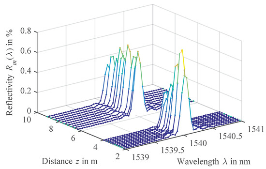 - Typically, the length of a grating in an FBG array is in the order of some millimeters, and the peak reflectivities are well below 5% to minimize interferences by crosstalk and power depletion [25]. As the spatial resolution of the iOFDR measurement system is in the range of centimeters and the group delay of a weakly-reflecting grating is very small, the gratings are modeled as wavelength-dependent point reflectors with reflectivity in good approximation.