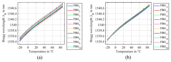 Evaluated Bragg wavelengths in the temperature range from −20 C–85 C and third order polynomial curve fits. Dots represent the Bragg wavelengths of 100 repeated measurements for each temperature. (a) First ten gratings. (b) Last ten gratings.