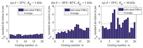 The variation of the Bragg wavelengths over 100 repeated measurements is shown in Figure 10a, measured at 25 C and an IF bandwidth of . On average, a low standard deviation of 1 pm was observed, which agreed with the simulation results reasonably well. Considering the temperature sensitivity observed in Figure 9, this would correspond to a temperature repeatability of about 0.1 K. Taking all temperature measurements between and into account, the average standard deviation increased to 2 pm, as shown in Figure 10b. This increase was mainly caused by temperature variations of the climate chamber controlling higher and lower temperatures, but was still well inside its temperature stability specification of ≤0.3 K. We also examined the penalty of increasing the intermediate bandwidth to 10 kHz. This reduced the sweep time of the VNA to 4.3 ms per measurement wavelength, but also decreased the SNR by approximately a factor of ten. In this case, an increase of almost 3 pm of the standard deviation at 25 is observed in Figure 10c.