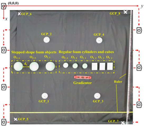 Figure 2 shows the experimental setup. Different objects were fixed on the black fiber surface and their positions were recorded based on a three-dimensional Cartesian coordinate system where the origin was the starting location of camera route, the positive x-axis toward east, the positive y-axis toward north and the positive z-axis toward up straightly. A gradienter was used to ensure the levelness of the test bed, and two rulers offered reference scale to calibrate the image measurements in x- and y-dimensions. Ground control points (GCPs) are critical for accurate dimension measurement using the imaging method [27]. In this study, eight GCPs marked by white labels were placed at the four corners of the test bed and in the middle of the imaging area (GCP_1 to GCP_8 in Figure 2) to serve as references for processing a 3D reconstruction model. The coordinates of GCPs were determined by manual measurement using a tape measure.