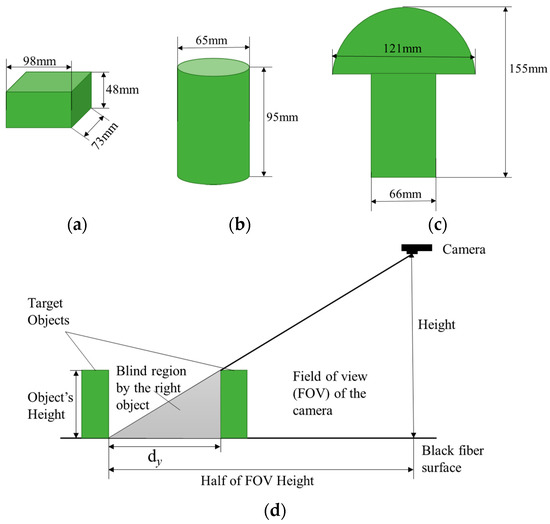 To mimic the different scenarios of plants, three kinds of artificial objects, i.e., cylinders, cuboids, and mushroom shape (Figure 3), were developed using foam materials (FloraCraftTM Dry Foam) and deployed on the top of the test bed. Each object (including replicates) were measured manually three times for each of the three dimensions (x, y, and z) using a caliper. The dimensions shown in Figure 3 are the rounded value of the average measured dimensions. The distance between objects (dy) was set to avoid blind regions on an object covered by any of its neighbors. Figure 3d shows how the distance was calculated.