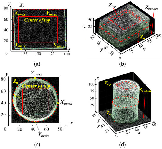 The starting location of the camera was set as the origin of the platform leading to negative z coordinates of all the objects below the camera based on the set coordination system. To simplify the height calculation, the z coordinates of the bottom (Zbottoms) of each individual object were set to zero and, therefore, the average z coordinates of the top (Ztops) of each object represented the height of the object. Figure 4 illustrates the dimension measurement approaches for three types of objects used in this study. To extract the Ztops of each object, the center part was manually selected as shown in Figure 4a,c,e. Zs of the selected points were divided into 20 bins using histogram counting (histcounts) function in MATLAB, and then five of the largest and five of the smallest bins were removed to get rid of the extreme points and noises as shown in Figure 4g. Meanwhile, the dimensions in x and y were also calculated using point cloud of segmented objects with the following procedure: First, the extreme points in x and y were selected from a group of points with a same Z. As illustrated in Figure 4a,c,e, four extreme points Xnmin, Xnmax, Ynmin and Ynmax were selected from the group of points with the same Z (marked as Zn), thus dimension in x at Zn was the difference between Xnmin and Xnmax, and in y was between Ynmin and Ynmax. Extreme points and noises of the dimensions in x and y at all Zs were removed based on the histogram in Figure 4g.