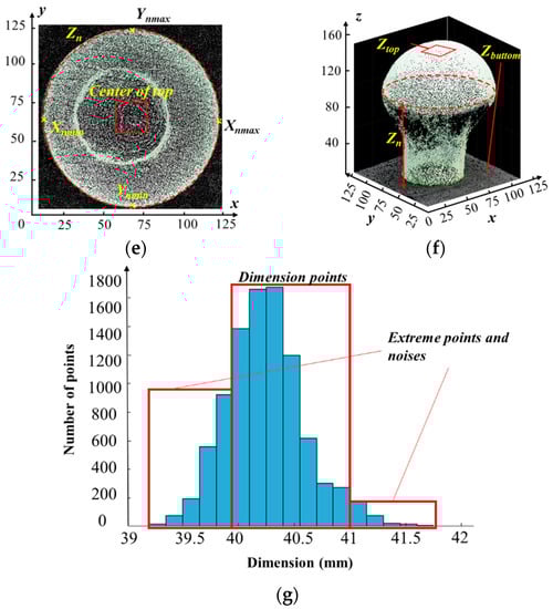 Illustration of the dimension measurement approaches using dense point clouds. Subfigures (b,d,f) are the 3D images of O1_1, O2_1 and O3_1, respectively. Subfigures (a,c,e) are the projected images in x-y plane and (g) shows the way to select dimension points and remove extreme points and noises. The x, y and z dimensional units used in (a–f) are mm.
