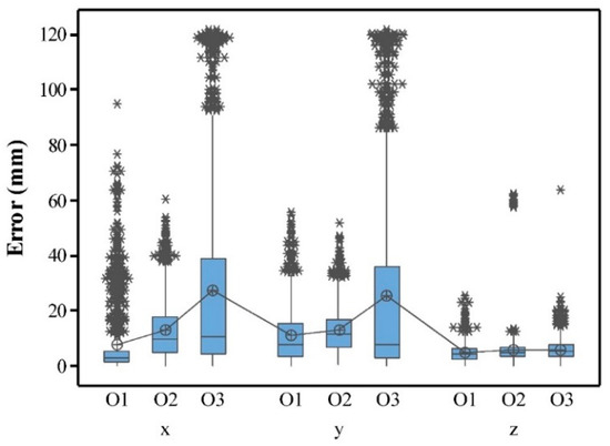 The effect of object shape was significant on the measurement errors in x and y direction (ANOVA, Table 4), where the errors were significantly higher (p-value < 0.001) in O3, followed by O2 and O1 (Figure 5). This was due to the hemisphere shape of O3 resulting in less points in the horizontal direction of (x and y) than those of O1 and O2 (Figure 4b,d,f). A similar finding was seen by [23] that more solid and homogenous surfaces lead to more accurate results.